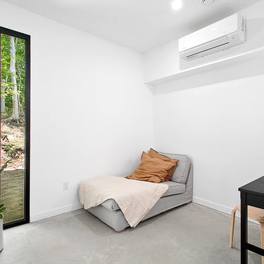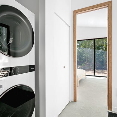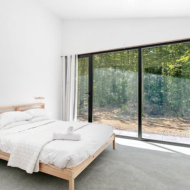 Blending natural materials with clean architectural lines, the design emphasizes simplicity, light, and a strong connection to the surrounding forest. Expansive windows bring the outdoors in, while the open-concept layout creates a warm and inviting living space.